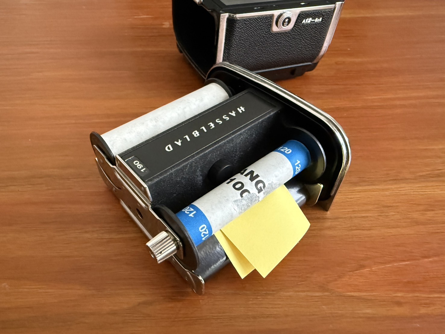 **コマ被りの対策として、大き目の付箋を二枚フィルムを巻き込む際に間に差し込んでいます。