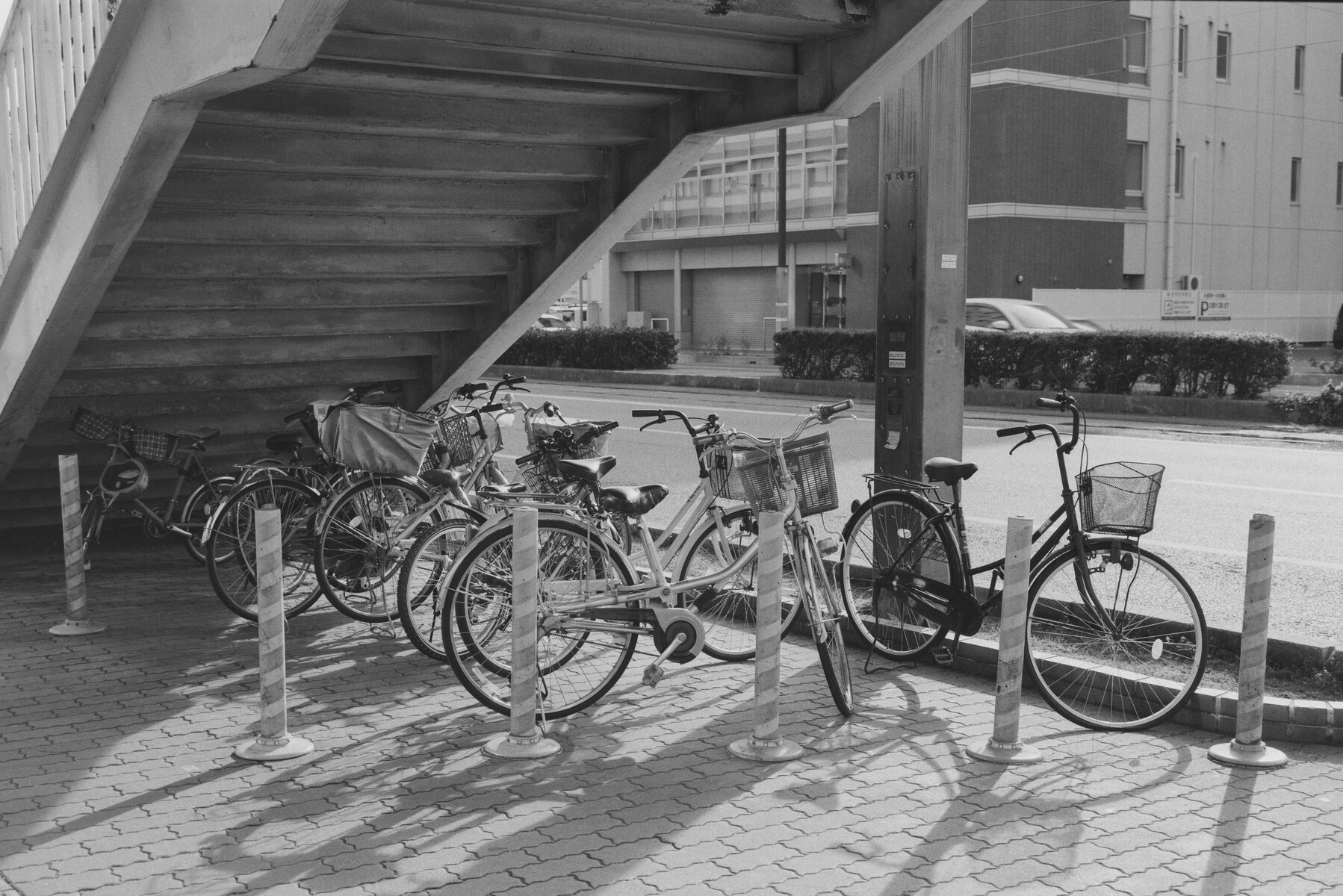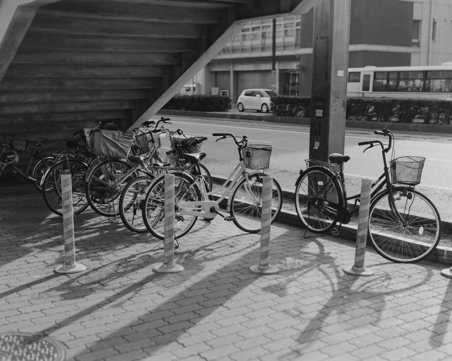 全体像を見た感じだと、大きな差は感じられません。フォーマットこそ小さいですが、焦点距離が短く被写界深度が深くなっているGW690の方が手前のポールなどは綺麗に見えてしまいます。一方で拡大図(画面中央左側の自転車のメーター付近)では、自転車のかごの輪郭などはTOYO45Aの方が優れています。