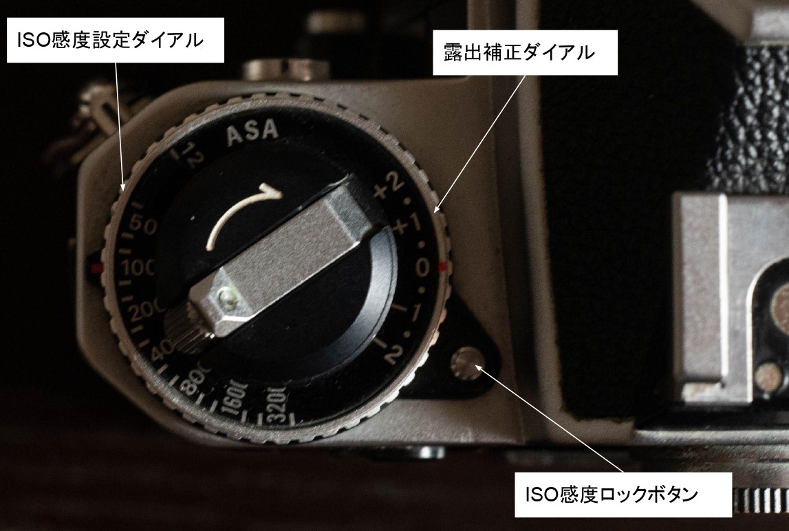 また、この時にフィルムのISO感度に合わせてカメラの感度設定もダイアルを回して調整しておきましょう。ISO感度ロックボタンを押しながら回してISO感度を設定し、外縁の銀色のリング部を上に軽く持ち上げながら回転させることで露出補正を設定できます。