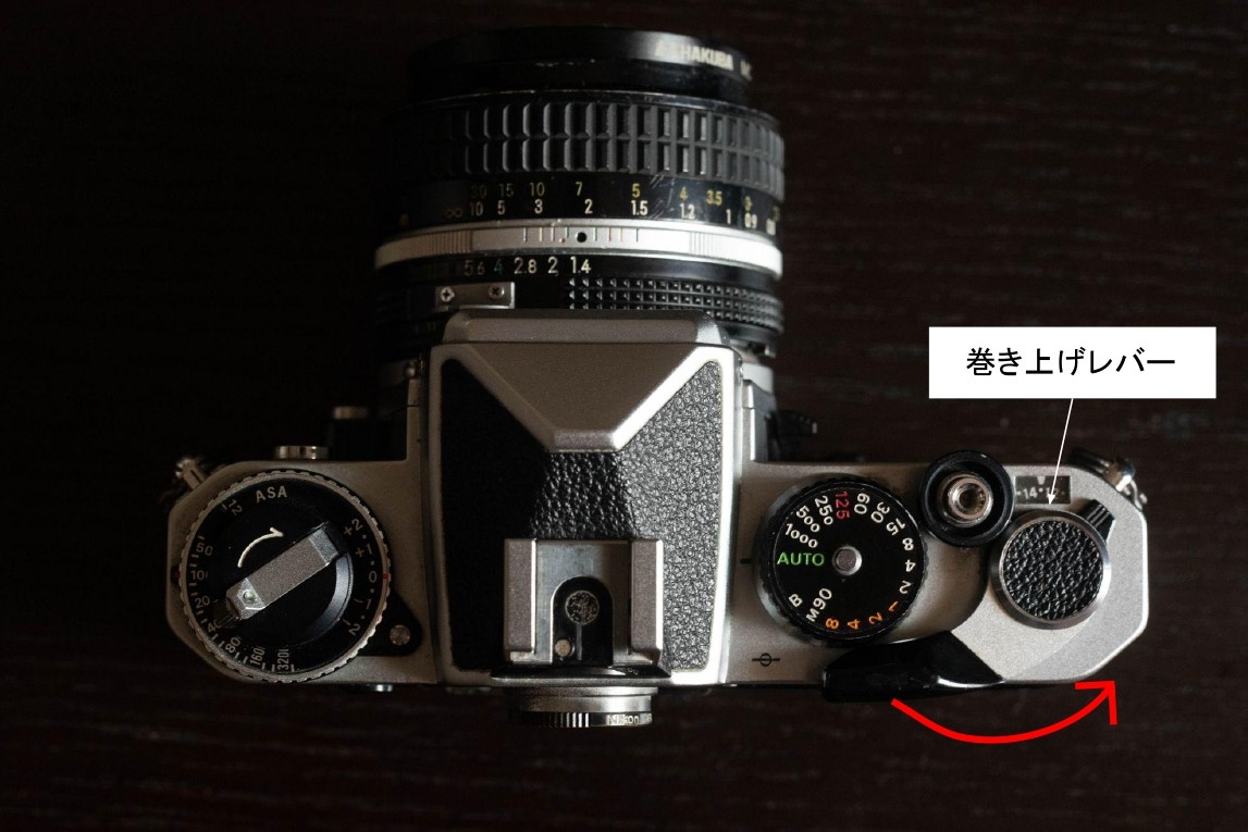 フィルムは1カットごとに巻き上げを行う必要があります。巻き上げレバーを外側に向かって回します。この時に巻き戻しレバーをある程度テンションがかかるまで巻いておくと(巻き上げレバーにプリントされてる白い矢印方向)、巻き上げレバーと連動して回転しフィルムがカメラにきちんと装填されていることが確認できます。
