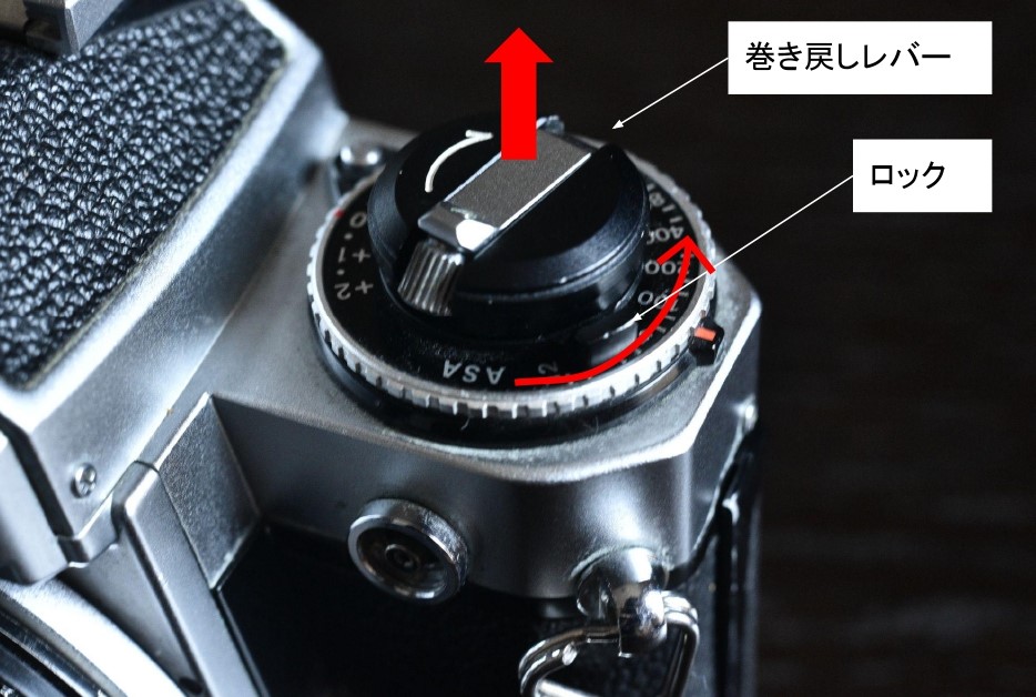 この時、ロック解除をせずに無理に巻き戻しレバーを回すとフィルムがねじ切れたり、カメラの故障の原因になるのでかなわず解除ボタンを押しましょう。